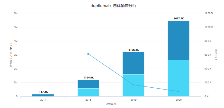 上市后,Dupixent销售额一路高歌,首年实现销售额 2.47亿美元;2018年实现销售额8.73亿美元;2019年全球销售收入即达到23亿美元。2020年销售额达35.34亿欧元,增加73.9%。已然成为重磅炸弹药。