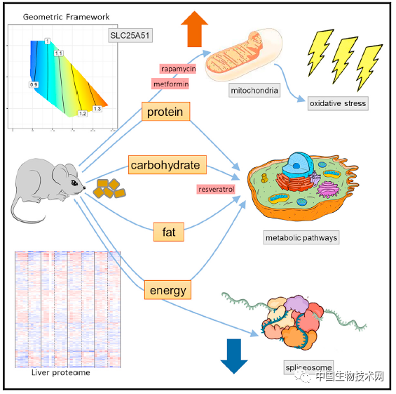 该研究利用几何框架解释了在二甲双胍、雷帕霉素或白藜芦醇存在或不存在的情况下,饮食与肝脏蛋白质组在广泛大量营养素摄入量下的生理反应之间的复杂关系。在受饮食影响的大量蛋白质和途径中,低热量摄入增加了剪接体蛋白的丰度;而蛋白质摄入量与线粒体蛋白的丰度呈正相关,会导致氧化应激。