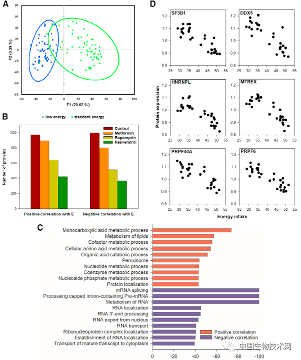 总的来说,二甲双胍、雷帕霉素和白藜芦醇或者减少了与能量摄入显著相关的蛋白质的数量,或者抑制甚至逆转了蛋白质丰度和能量摄入之间关系的斜率。雷帕霉素和白藜芦醇比二甲双胍有更大的影响,包括对低能量摄入的剪接体反应的下调。