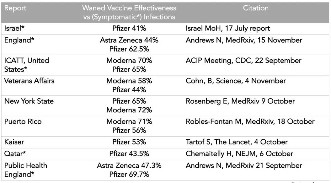 美国国家科学院院士 Eric Topol 博士列出的疫苗有效性下降的研究(图源:Twitter @Eric Topol)