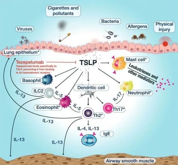 TSLP是一种针对促炎性刺激(例如肺内过敏原、病毒及其他病原体)产生的上皮细胞因子,在气道炎症的发生和持续中起着关键作用。TSLP驱动下游T2细胞因子的释放,包括IL-4、IL-5和IL-13,导致炎症和哮喘症状。TSLP也能激活参与非T2驱动炎症的多种类型细胞。因此,TSLP在炎症级联反应的早期上游活动已被确定为在广泛哮喘患者群体中的一个潜在靶点。阻断TSLP可阻止免疫细胞释放促炎细胞因子,从而预防哮喘恶化、改善哮喘控制。