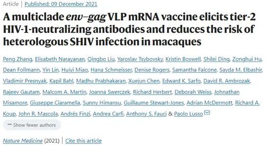 Peng Zhang et al. A multiclade env–gag VLP mRNA vaccine elicits tier-2 HIV-1-neutralizing antibodies and reduces the risk of heterologous SHIV infection in macaques. Nature Medicine, 2021, doi:10.1038/s41591-021-01574-5.