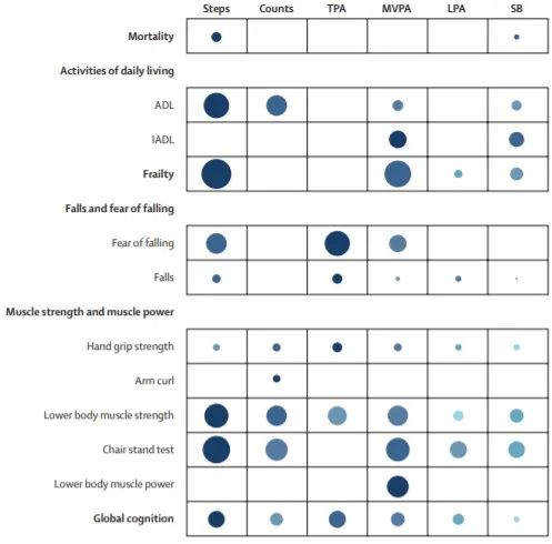 该综述纳入了6项系统评价,共涉及1017项研究,参与者的年龄为60岁~92岁。这些研究者量化了参与者的客观身体活动与相关临床结果之间的关联:反映身体活动的指标包括步数、活动次数、身体活动的总体持续时间、中等至剧烈身体活动的持续时间、轻度身体活动的持续时间,以及久坐持续时间。