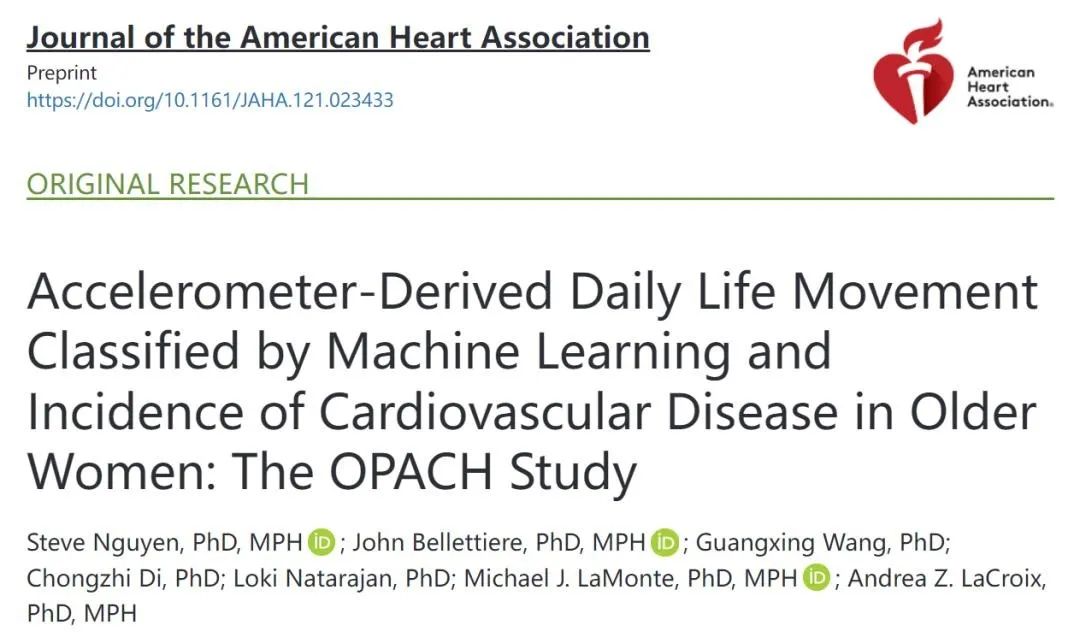 【2】 Nguyen S, Bellettiere J, Wang G, Di C,Natarajan L, LaMonte MJ, LaCroix AZ. Accelerometer-Derived Daily Life MovementClassified by Machine Learning and Incidence of Cardiovascular Disease in OlderWomen: The OPACH Study. J Am Heart Assoc. 2022 Feb 22:e023433. doi:10.1161/JAHA.121.023433.