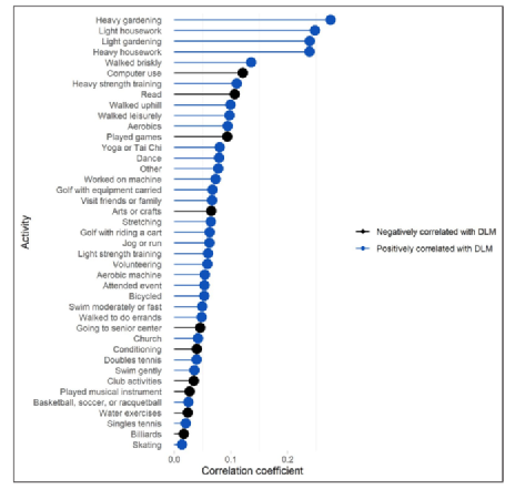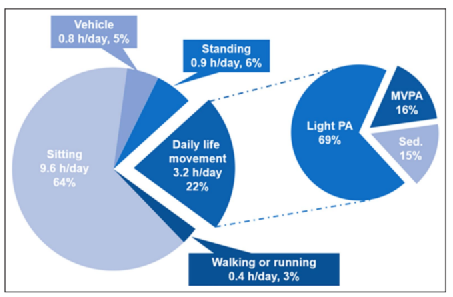 研究发现在一天的清醒时间中,人们约有22%的时间用于DLM,64%的时间用于坐着,6%的时间用于站着,5%的时间在交通工具上,3%的的时间用于行走或跑步。