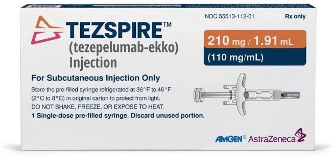 2021年12月,Tezspire获得美国FDA批准:作为一种附加维持疗法,用于治疗年龄≥12岁的严重哮喘儿科患者和成人患者。Tezspire通过优先审查程序获得批准。在2018年9月,美国FDA授予了tezepelumab治疗无嗜酸性粒细胞表型严重哮喘的突破性药物资格(BTD)。