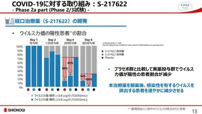 值得注意的是,据国金证券研报显示的Ⅱa期抗病毒和安全结果,第6天核酸检测时,服用低剂量S-217622的患者检测结果全部呈阴性(<0.8 Log10 ( TCID50/mL ) ),病毒阳性患者下降幅度达100%,而这也正是“治愈率100%”这一说法的来源。