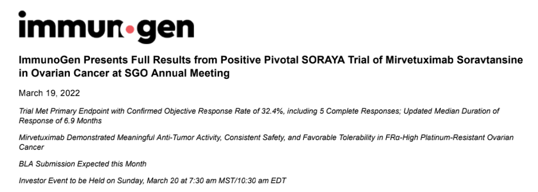 SORAYA 试验评估了 IMGN853 单药治疗 FRα 高表达的铂耐药卵巢癌的安全性和有效性,患者入选标准是 FRα 高表达、先前已接受过至多 3 种治疗方案且至少接受过一种含贝伐珠单抗治疗的铂耐药卵巢癌患者。该研究的主要终点为研究者评估的客观缓解率(Objective Response Rate, ORR),包括完全缓解和部分缓解,次要终点是缓解持续时间(Duration of Response, DOR)。