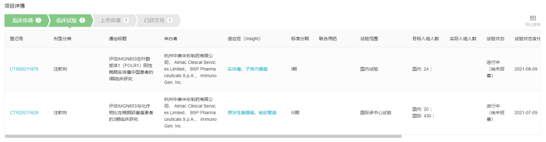 而在中国,IMGN853 的中国首个临床试验申请在 2021 年 3 月获得 NMPA 批准,目前已经启动一项国际多中心 Ⅲ 期研究和一项评价中国成人患者中的安全性、耐受性和药代动力学的 Ⅰ 期研究。另一中国关键性单臂临床试验也于 2021 年 8 月获得 NMPA 批准。华东医药已经完成了两项临床试验的首例受试者入组及给药。