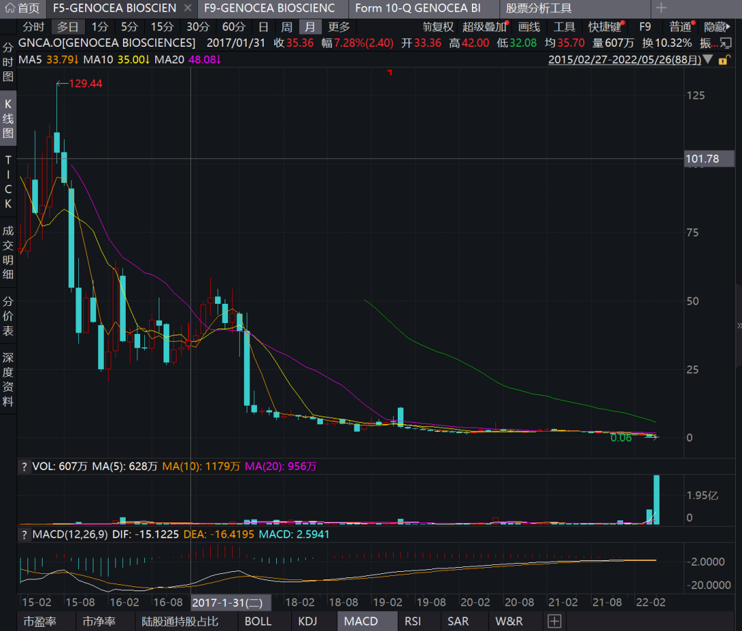 值得注意的是,截至2022年5月26日美股收盘,Genocea股价已经跌至0.07美元/股,相比上市后的最高价(前复权)191.92美元下跌99%,总市值已不足500万美元。