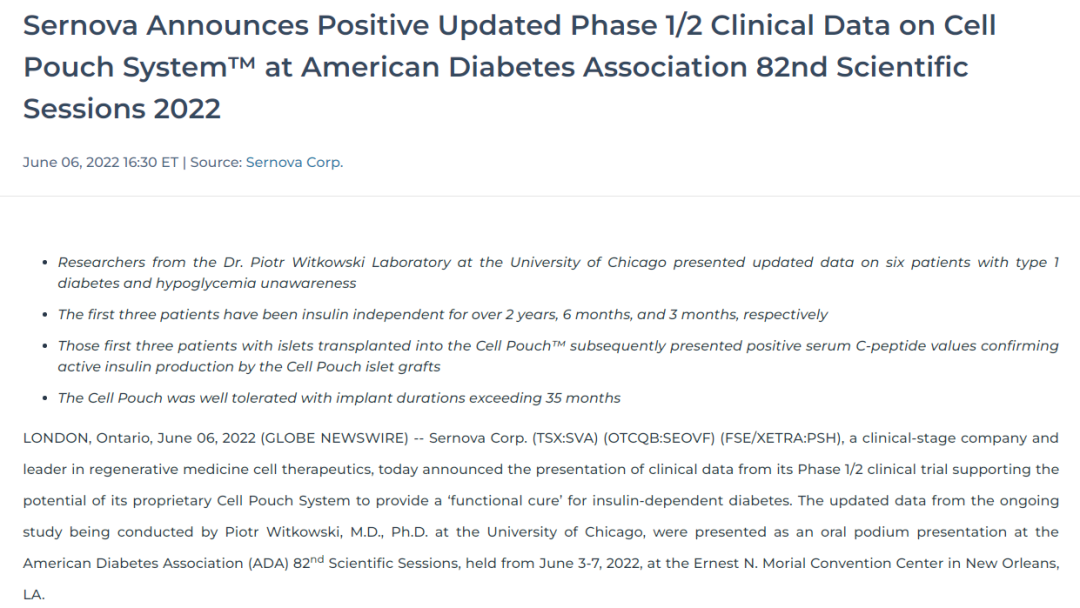 日前,再生医学细胞疗法研发公司Sernova在美国糖尿病协会科学会议上公布了其独特的细胞袋(cell pouch)系统的1/2期临床试验结果。结果显示,3名此前依赖胰岛素治疗的1型糖尿病患者在接受基于细胞袋系统的新型疗法治疗后脱离胰岛素治疗分别超过2年、6个月和3个月,同时细胞袋系统耐受性良好,植入持续时间超过35个月。