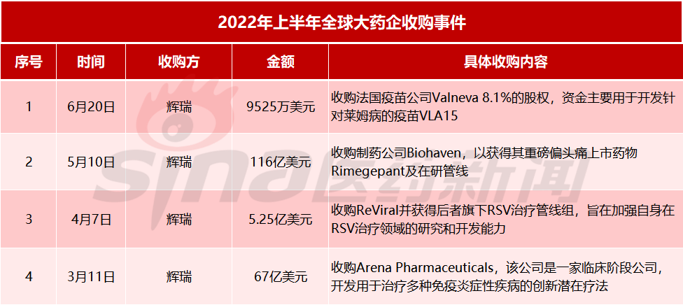 除了早些年的分拆,去年因新冠红利而赚的盆满钵满的辉瑞,今年上半年立刻开启了一系列的并购,并创造了今年以来医药行业的最高金额的并购案——116亿美元的价格收购制药公司Biohaven。