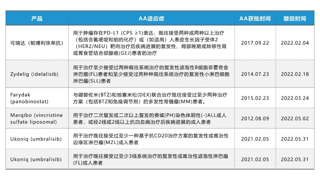 根据官网的公开资料,2022年上半年,FDA共撤回了6个肿瘤AA适应症,涉及5个产品,且基本集中在血液肿瘤领域,这是怎么回事呢?让我们一探究竟。