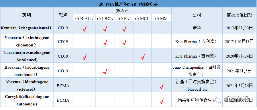至此,FDA批准CAR-T细胞疗法血液肿瘤适应症,吉利德的两种产品获批单独(细分)适应症,Yescarta用于一线化学免疫治疗无效或治疗后12个月内复发大B细胞淋巴瘤成年患者和Tecartus用于复发或难治性套细胞淋巴瘤(MCL)成年患者,其他四种适应症都至少有两种产品在竞争。