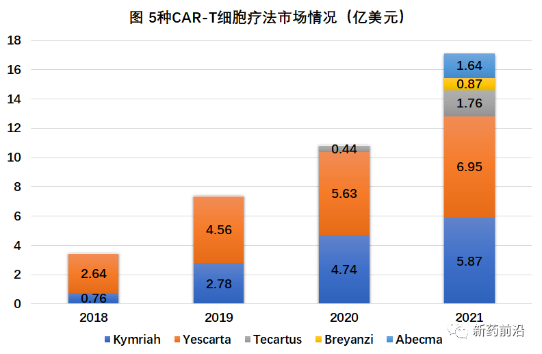 尽管吉利德Yescarta比诺华的Kymriah晚获批一个多月,但前者市场表现抢眼,历年销售收入都远远高于后者,其中2021年两款药物分别为其公司带来了5.87亿美元和6.95亿美元收入。