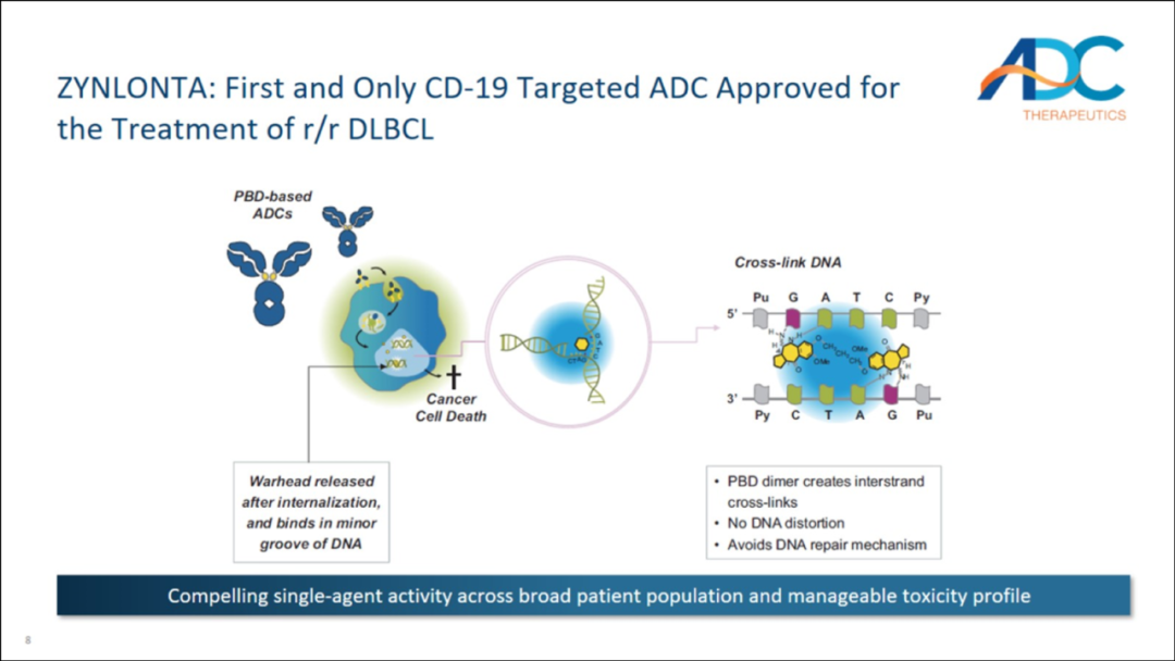 Zynlonta是一种靶向CD19蛋白的抗体偶联药物。当Zynlonta与表达CD19的细胞结合时,此药物会被细胞内化(internalized),细胞内的酶会释放CD19抗体所负载的吡咯并苯并二氮杂卓(pyrrolobenzodiazepine,PBD)二聚体细胞毒素。此PBD毒素可以与DNA小沟结合,最终造成细胞周期停止与肿瘤细胞的死亡。2021年,美国FDA已通过加速批准方式批准Zynlonta用于治疗已接受过至少二线以上系统疗法的复发性/难治性大B细胞淋巴瘤病患,其中也包含弥散性大B细胞淋巴瘤(DLBCL)、高级别B细胞淋巴瘤。这是第一个,也是目前唯一一个治疗复发性/难治性DLBCL成人病患的CD19靶向单药抗体偶联药物疗法。