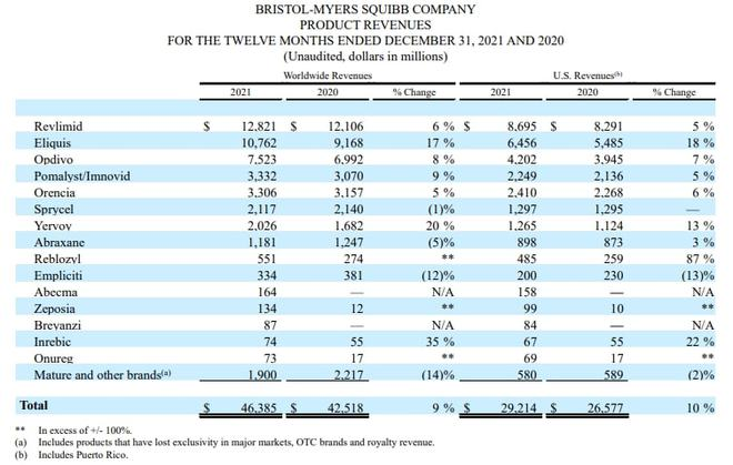 BMS 2021财报:O药75亿美元重回增长!新生代产品静待花开