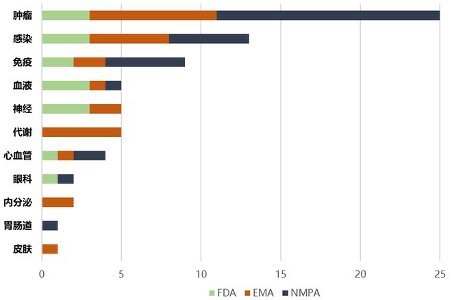 2022年COVID 19病毒所造成的疫情仍然在持续,获批的新药中分类排名第二的抗感染药物,EMA和NMPA都有批准用于COVID-19治疗的药物和预防的疫苗。