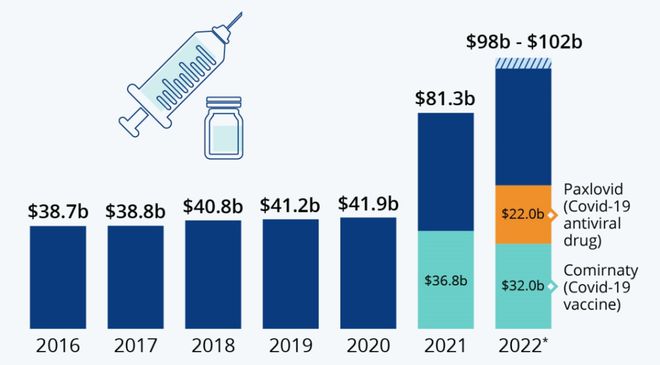 随着口服COVID-19治疗药物Paxlovid获得了包括EMA或NMPA等更多国家和地区的EUA,辉瑞预测其2022年销售额将达到220亿美元,2022年第一季度已经能达15亿美元。