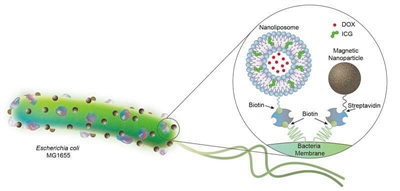 为构建出这款机器人,研究小组将几个纳米脂质体连接到每个大肠杆菌上,这些球形脂质体外层包裹着吲哚菁绿(ICG,绿色颗粒),当受到近红外光照射时,ICG会融化。脂质体的水性核心内则包裹着水溶性化疗药物分子(DOX)。研究人员还在细菌上附着了磁性氧化铁纳米颗粒,当暴露在磁场中时,这种磁性颗粒可以作为微生物高速运动的助推器。连接脂质体和磁性颗粒与细菌的“绳索”则是一种非常稳定且难以破坏的链霉亲和素和生物素复合物。