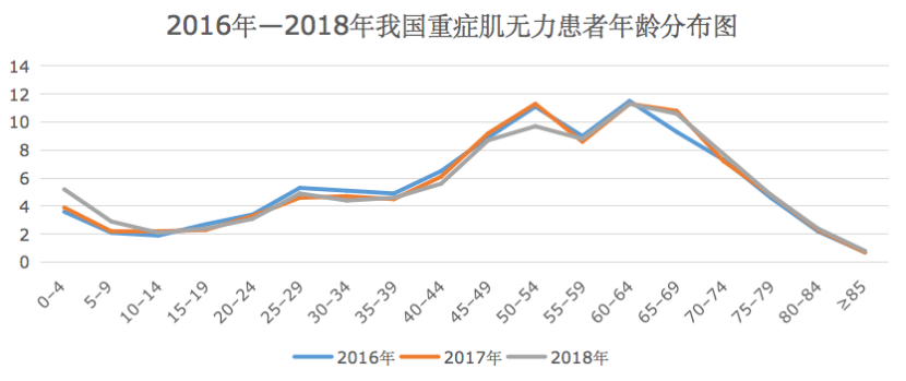 如下图所示,2016—2018年我国重症肌无力患者年龄主要集中在30岁以后,其中以50—70岁的中老年人为主。这意味着,随着我国老龄化趋势加深,患病群体数量或许会进一步增长。