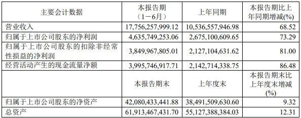 财报显示,今年上半年,药明康德实现营业收入177.56亿元,同比增长68.52%;归母净利润46.36亿元,同比增长73.29%;期内盈利金额已创出同期历史最高水平。