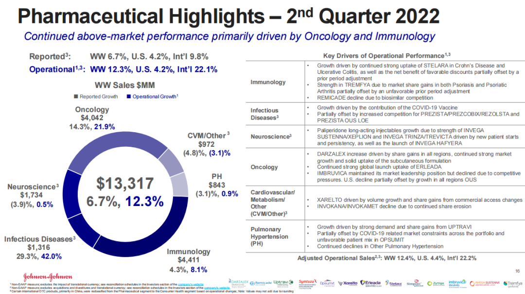 所有业务中,制药业务贡献的销售额最大。强生表示,业绩增长的驱动因素主要来自免疫和抗肿瘤两大领域。