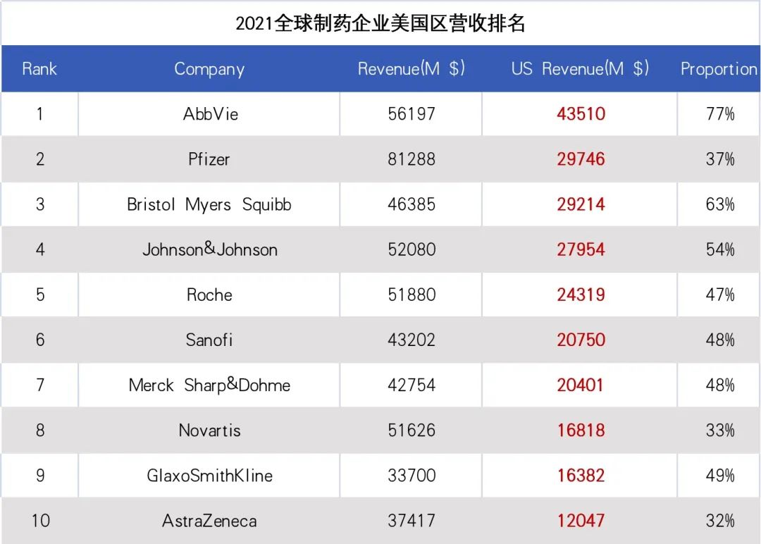 BMS排名第三,2021年在美国区营收292.14亿美元,略低于辉瑞,占总营收63%。