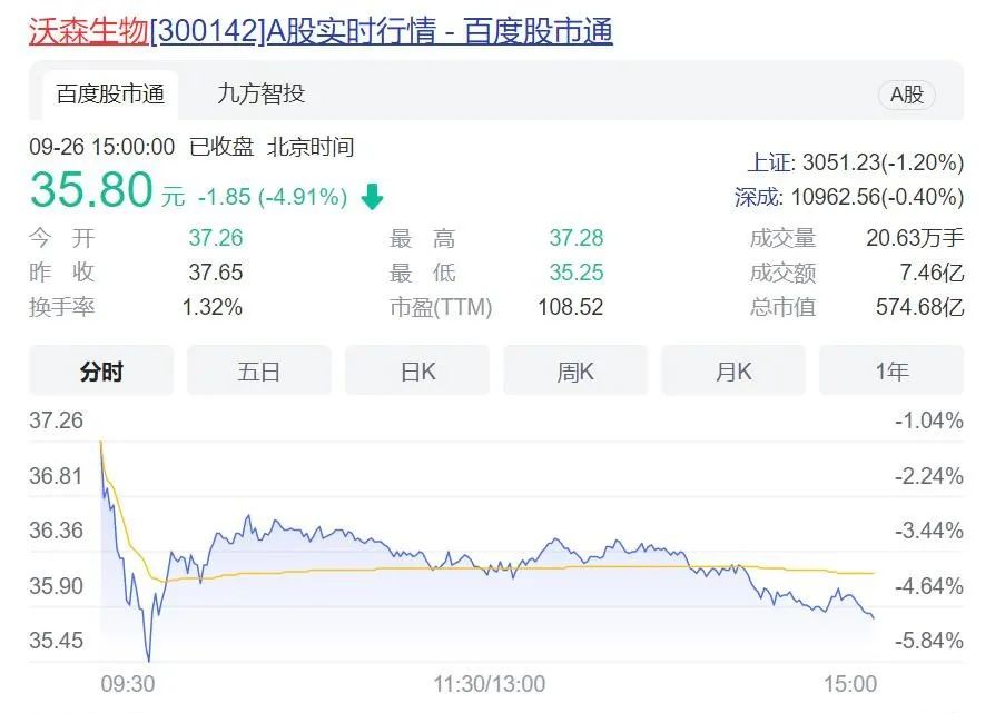 9月26日,市值超过500亿的疫苗赛道“大白马”沃森生物,开盘短短半小时之内就暴跌超过5%,虽然后市股价有所反弹,但依旧难以抵挡低迷的市场情绪,最终以35.80元收盘,全天下跌4.91%。