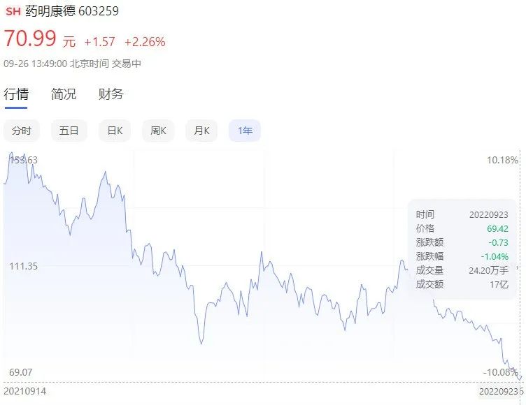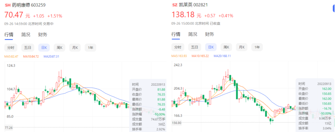 9月13日中秋假期后的第一个交易日,CXO“龙头”药明康德跌停(-10%),于2022年以来已经下跌约40%。而CDMO明星企业凯莱英也在同日跌停(-10%),一年内跌幅超50%。药明康德在9月14日至22日期间股市持续收阴,而9月23日收市更是失守了70元大关,跌至一年内最低价。