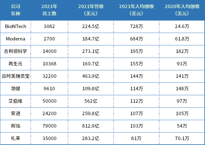 注:该榜单只统计了2021年收入超过100亿美元的药企;人均创收为2021年的营收除以公司员工总数