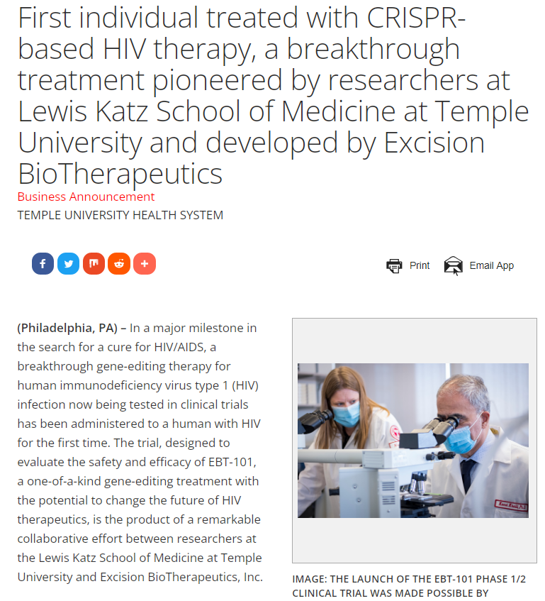 EBT-101由美国坦普尔大学Lewis Katz医学院以及Excision生物治疗公司共同开发,是一种通过腺相关病毒(AAV)来传递CRISPR-Cas9进行基因编辑的体内基因疗法。同时,EBT-101使用针对HIV基因组不同区域的多个单向导RNA,从人类细胞基因组中切割HIV DNA,从而最大限度地减少潜在的病毒逃逸,最终实现对艾滋病的治疗和治愈。此外,由于该疗法靶向的是病毒DNA而不是人类基因,因此脱靶编辑的风险也较小。