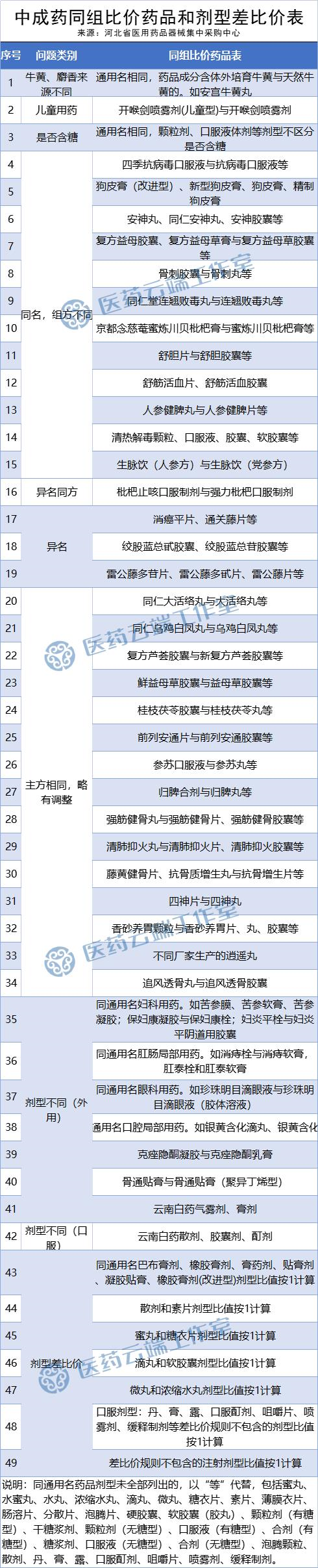 而在中成药同组比价表中,将问题分为:牛黄麝香来源不同、儿童用药、是否含糖、同名组方不同、异名同方、异名、主方相同略有调整、剂型不同(外用)等几种情况。