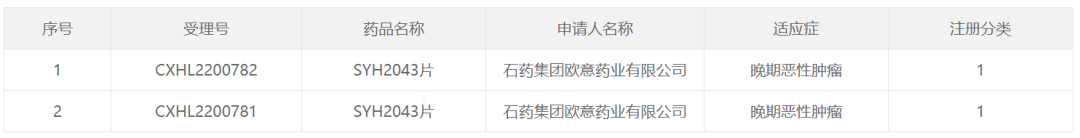 [1]石药集团自愿公告 - 口服小分子CDK抑制剂SYH2043获临床试验批准 . Retrieved Dec 28 , 2022. From http://www.cninfo.com.cn/new/disclosure/detail?stockCode=01093&announcementId=1215469417&orgId=gshk0001093&announcementTime=2022-12-28