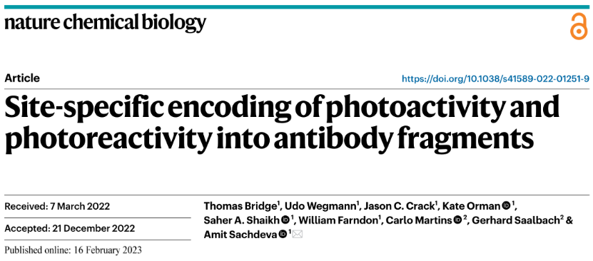 Bridge T, Wegmann U, Crack JC, Orman K, Shaikh SA, Farndon W, Martins C, Saalbach G, Sachdeva A. Site-specific encoding of photoactivity and photoreactivity into antibody fragments. Nat Chem Biol. 2023 Feb 16. doi: 10.1038/s41589-022-01251-9.