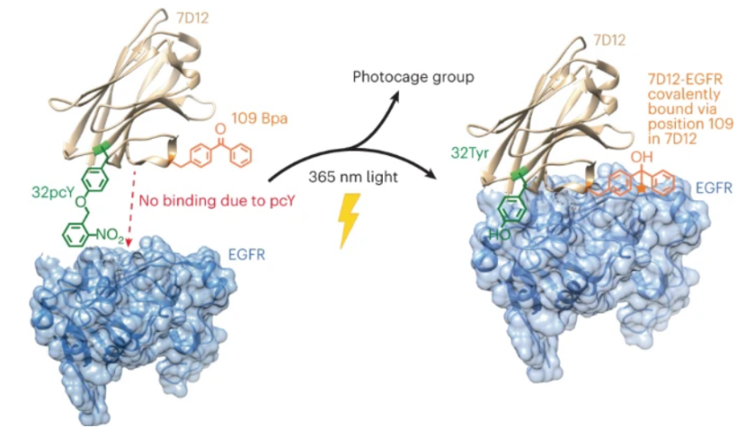 简而言之,作者开发了一种光活性-光反应性7D12-32pcY-109Bpa突变抗体片段,这种抗体片段和EGFR的共价结合受到光调控,可以解决普通抗体的毒性和停留时间短的问题。