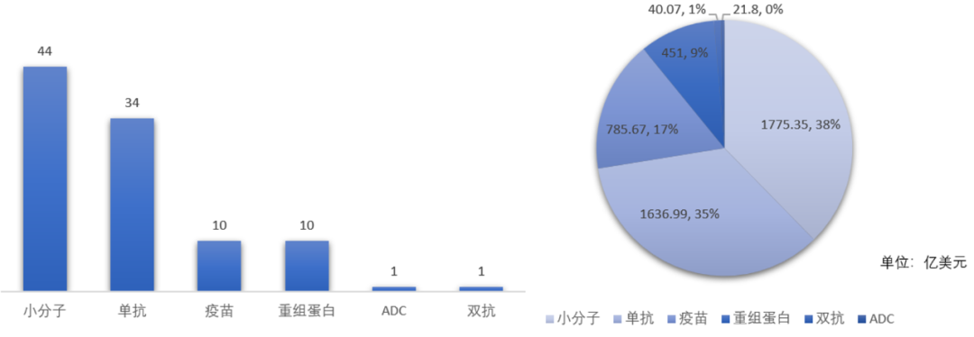 可以看出,小分子和单抗类药品无论数量还是销售总额都是TOP100榜单占比最多的两种类型,市场份额逐年递增。