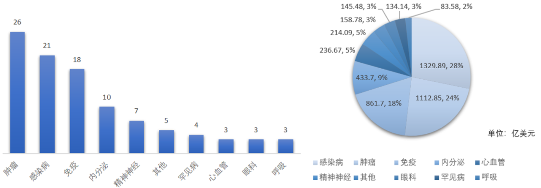 2022年TOP100药品疾病领域分布(数量、销售额)
