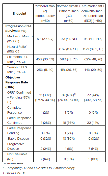 在数据截止日期(2023年2月7日)时,对所有随机分配并接受治疗的患者(n=150)所进行的安全性和有效性评估显示,在大约18个月的中位随访期间,包含domvanalimab的两个队列都显示出持续并具临床意义的ORR改善。分析显示,zimberelimab单药疗法(n=50)、双联疗法(n=50)与三联疗法(n=50)的确认ORR分别为27%、41%和40%。而相比于单药疗法,双联疗法降低了疾病进展或死亡风险33%,三联疗法则降低了28%。此外,单药疗法的PFS为5.4个月(95% CI:2.7-9.7),双联与三联疗法的PFS则分别为9.3个月(95% CI:4.1-NE)与9.9个月(95% CI:4.8-14.6)。试验的总生存期数据尚未成熟。