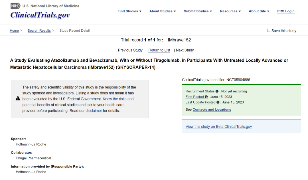 6 月 15 日,罗氏在 ClinicalTrials.gov 上登记了 Tiragolumab 联用阿替利珠单抗 + 贝伐珠单抗一线治疗肝细胞癌的 III 期临床,试验代号为 IMbrave152 / SKYSCRAPER-14(登记号:NCT05904886)。