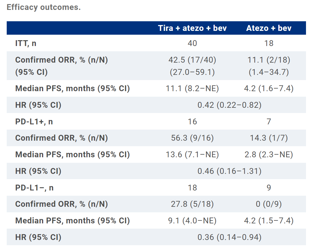 共 58 例患者随机分组至 tira 组(tira + atezo + bev,n=40)或双药联合疗法组(atezo + bev,n=18)。截至 2022 年 11 月 28 日,tira 组和对照组的中位随访时间分别为 14.0 个月和 11.8 个月,tira 组确认的 ORR 显著高于对照组,分别为 42.5% vs 11.1%。中位 PFS 分别为 11.1 个月(95% CI: 8.2–NE)vs 4.2 个月(95% CI: 1.6–7.4),对应的风险比为 0.42(95% CI: 0.22–0.82)。在 PD-L1+(n=23)和 PD-L1-(n=27)两个亚组中,均观察到类似的 tiragolumab 联合疗法组的 ORR 和 PFS 获益结果。
