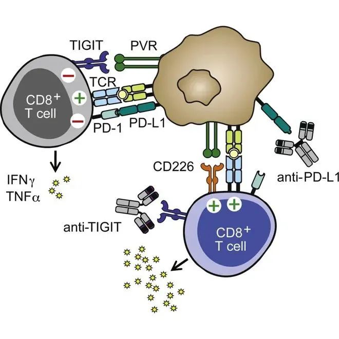 TIGIT(T cell immunoglobulin and ITIM domain,T细胞免疫球蛋白和ITIM结构域)是免疫细胞上的一种蛋白质受体,和PD-1类似,起到抑制免疫反应的作用,肿瘤细胞可以利用TIGIT来逃避免疫系统的攻击,实现免疫逃逸。研究表明,在肿瘤发展过程中由于TIGIT的存在,NK细胞经常处于耗竭状态,而只有一小部分NK细胞表面有PD-1或CTLA-4,这就意味着单纯使用PD-1抑制剂不会恢复大多数NK细胞的战斗力。在使用动物模型验证后,发现抗TIGIT单抗可逆转NK细胞耗竭并可用于多种肿瘤的免疫治疗。因此,TIGIT有望成为新一代免疫治疗靶点。
