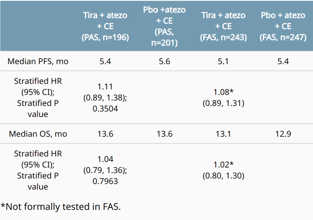 结果显示,Tiragolumab联合Tecentriq+化疗组与Tecentriq+化疗组的中位PFS分别为5.4个月vs5.6个月;总生存期(OS)分别为13.6个月vs13.6个月;两组不良事件(AE)发生率相似。研究表明,对于未经治疗的ES-SCLC患者,与Tecentriq+化疗组相比,Tiragolumab+Tecentriq+化疗组无法显著延长PFS和OS。