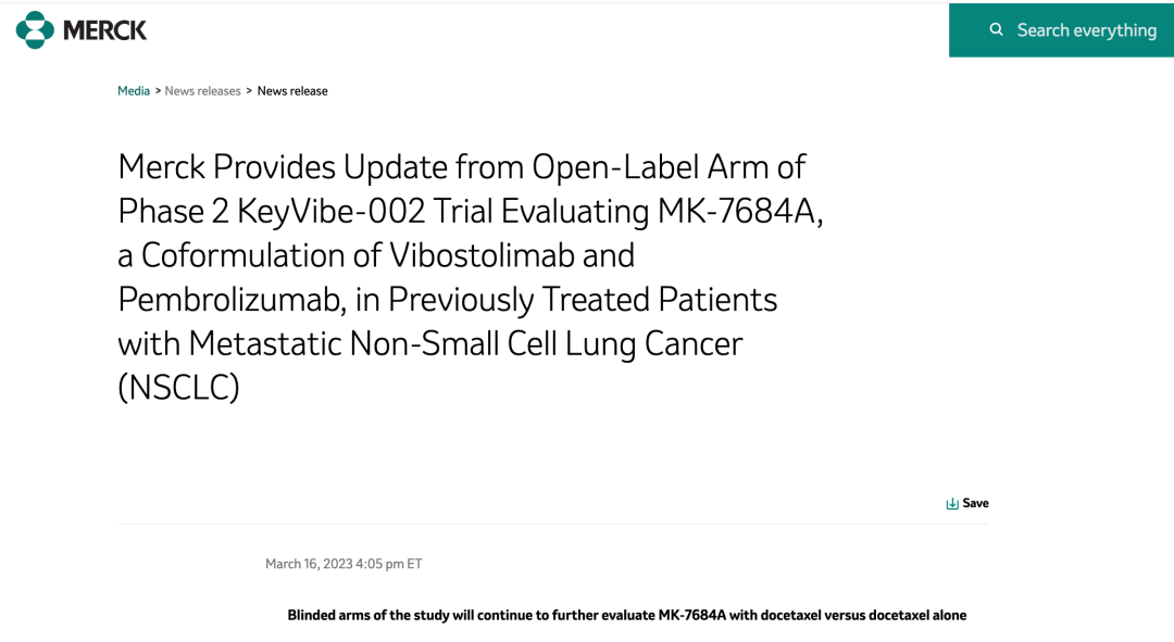 今年3月16日,默沙东宣布其PD-1+TIGIT复方制剂MK-7684A 治疗转移性NSCLC的II期非注册KeyVibe-002研究的最新结果未达预期。
