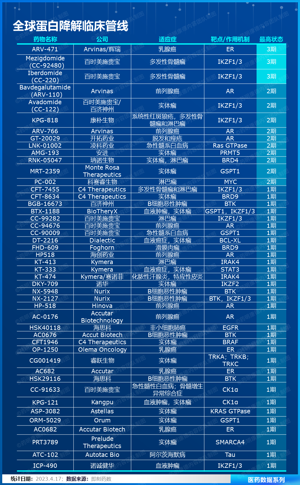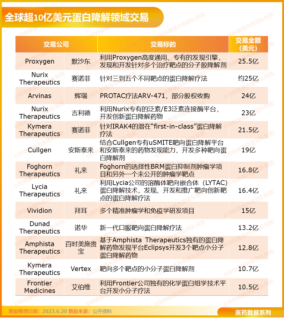 蛋白降解领域其独特的治疗机理,获得多家大型药企的青睐。活跃的交易活动推动了该领域的不断发展,催生了许多创新疗法的诞生。希望在不久的将来,蛋白降解领域的疗法能够造福患者,为他们带来更多的治疗希望和更好的治疗体验。