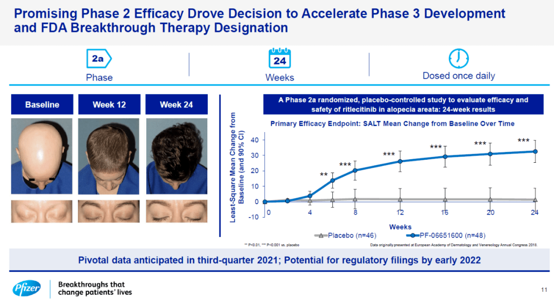 另外一项正在进行的开放标签的、长期的III期ALLEGRO-LT研究,旨在评估ritlecitinib在脱发率为25%或以上的成人斑秃患者和脱发率为50%或以上的12岁青少年斑秃患者中的安全性和有效性。