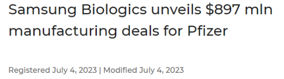 7月4日,三星生物制剂公司(Samsung Biologics)宣布与辉瑞公司(Pfizer)达成两项协议,总价值达8.97亿美元,包括一份7.04亿美元的合同,以及一份1.93亿美元的订单,这是此前3月份宣布的一项交易的后续订单。