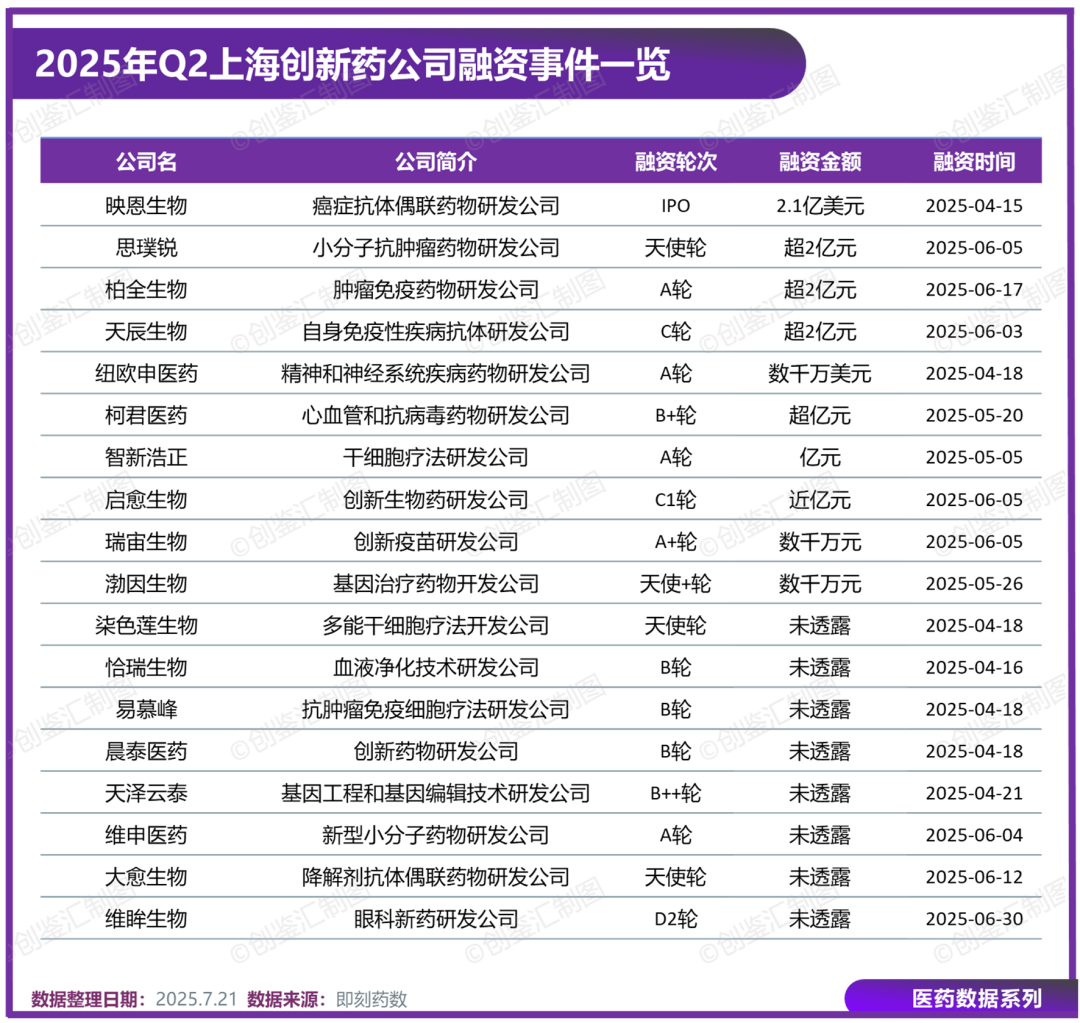 2025年第二季度,上海创新药领域展现出强劲活力。据公开披露数据,本季度上海至少有18家创新药公司完成融资,已披露融资总额超26亿元。上海凭借其成熟的生物医药产业集群、浦东张江等核心区域的研发高地优势,以及活跃的资本支持,持续引领技术创新与产业升级。本季度融资亮点显著: