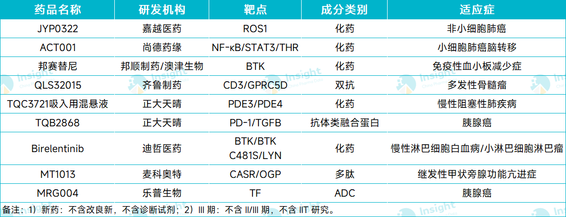 据 Insight 数据库统计,8 月份(8.1-8.27),有 9 款国产新药首次进入 III 期临床阶段,开始向上市申请发起冲刺。