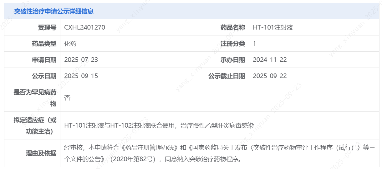 9月23日,星曜坤泽宣布其自主研发的HT-101注射液联合HT-102注射液正式被中国国家药监局(NMPA)纳入突破性治疗品种,拟定适应症为治疗慢性乙型肝炎病毒感染。